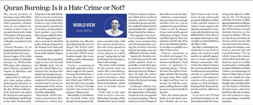 The recent incident of burning a copy of the Holy Quran in Sweden has led to wider questions, whether such an act could be described as Hate Crime or not and what are the limits of Freedom of Expression, apart from why the culprit a Muslim committed such an act?