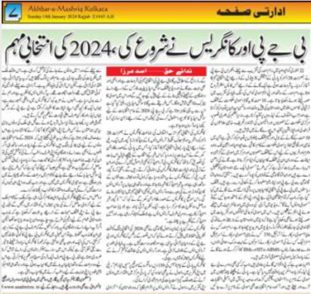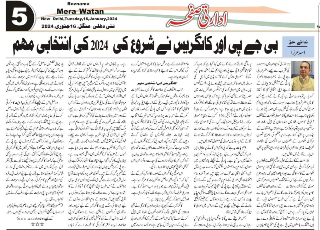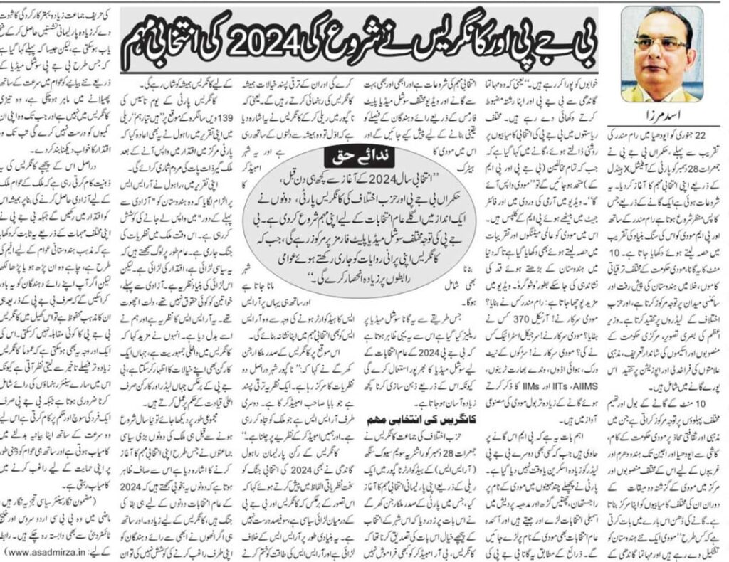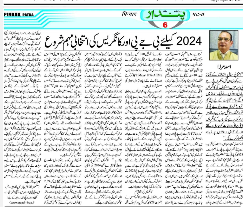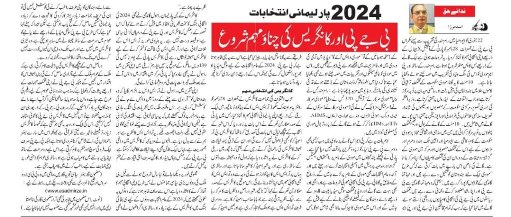 Categories Latest Articles in Urdu 2024 ke liye BJP Aur Congress Nein Shuru ki apni Intekhabi muhim Post author By am.media.nd@gmail.com Post date January 21, 2024 No Comments on 2024 ke liye BJP Aur Congress Nein Shuru ki apni Intekhabi muhim 132 total views, 2 views today https://m.thewireurdu.com/article/bjp-congress-2024-election-campaign/102874 ← 2024 aalami satah par jamhoori iqdar ka imtehan → An Unequal World Leave a Reply Cancel replyYour email address will not be published. Required fields are marked *Comment * Name * Email * Website Save my name, email, and website in this browser for the next time I comment.