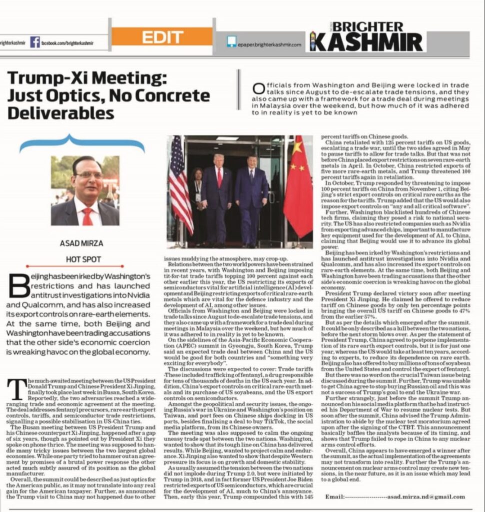 Further strangely, just before the summit Trump announced on his social media platform that he had instructed his Department of War to resume nuclear tests. But soon after the summit, China advised the Trump Administration to abide by the nuclear test moratorium agreed upon after the signing of the CTBT. This announcement basically baffles the analysts because of its timing, and shows that Trump failed to rope in China to any nuclear arms control efforts.