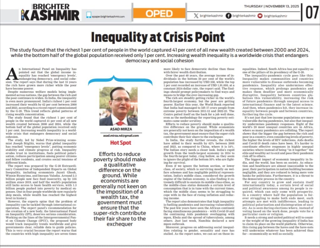 Despite numerous welfare models being implemented across nations, the gap between the rich and the poor continues to widen. In India, the inequality is even more pronounced. India’s richest 1 per cent increased their wealth by 62 per cent between 2000 and 2023, according to a recent report commissioned by the G-20. This trend reflects global patterns of rising wealth concentration.