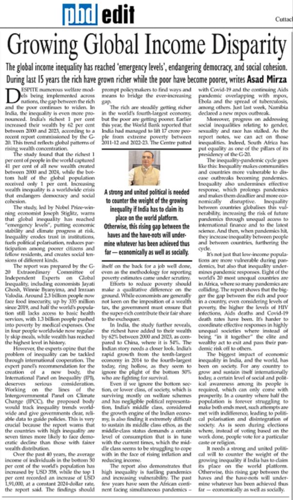 However, the experts opine that the problem of inequality can be tackled through international cooperation. The expert panel’s recommendation for the creation of a new body, the International Panel on Inequality (IPI), deserves serious consideration. Working on the lines of the Intergovernmental Panel on Climate Change (IPCC), the proposed body would track inequality trends worldwide and give governments clear, reliable data to guide policies. This is very crucial because the report warns that the countries with high inequality are seven times more likely to face democratic decline than those with fairer wealth distribution.