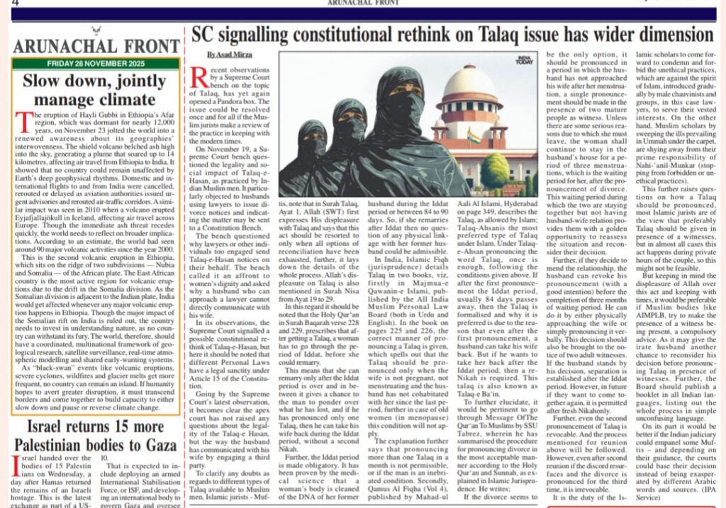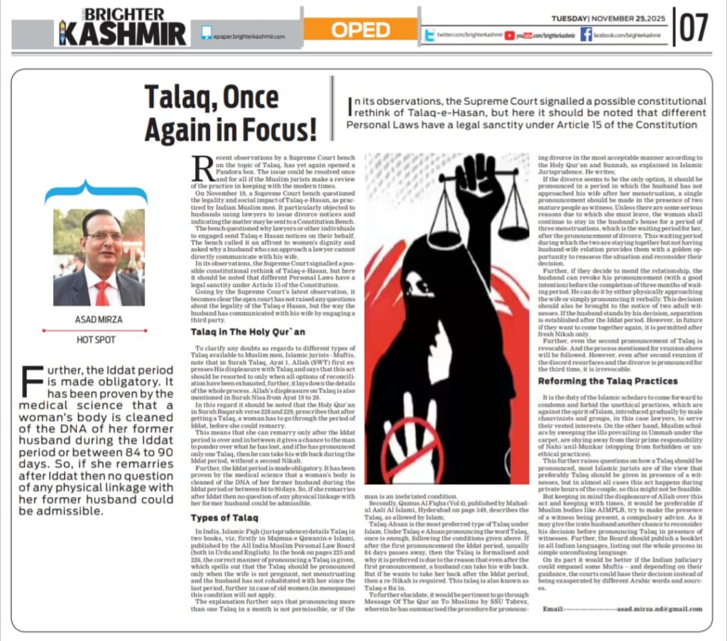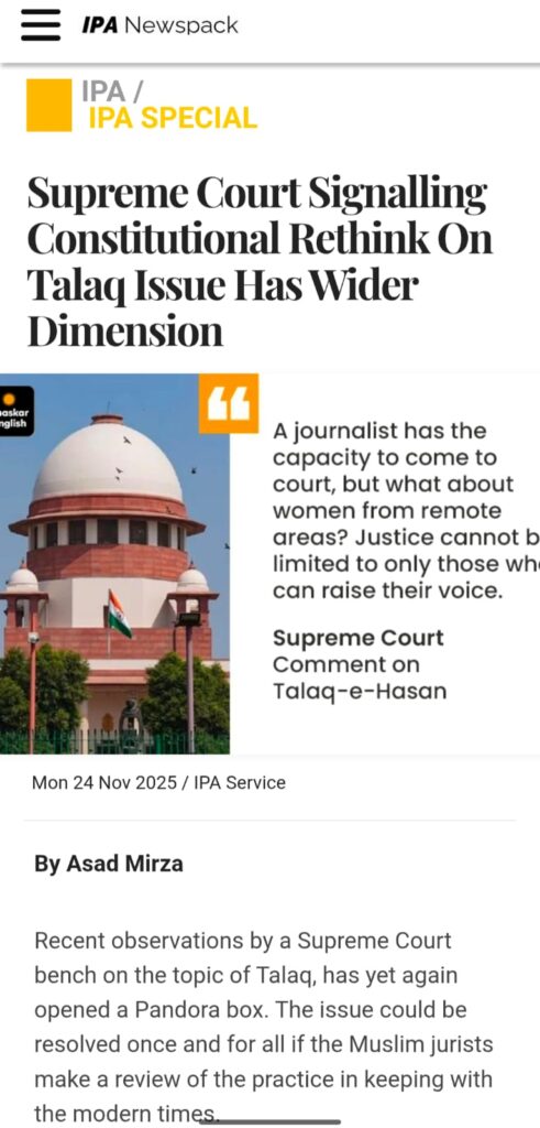 On November 19, a Supreme Court bench questioned the legality and social impact of Talaq-e-Hasan, as practiced by Indian Muslim men. It particularly objected to husbands using lawyers to issue divorce notices and indicating the matter may be sent to a Constitution Bench.