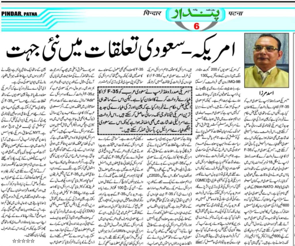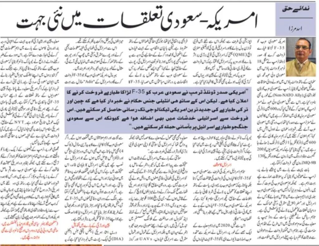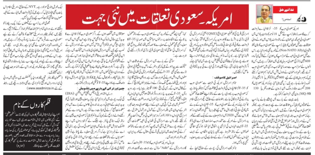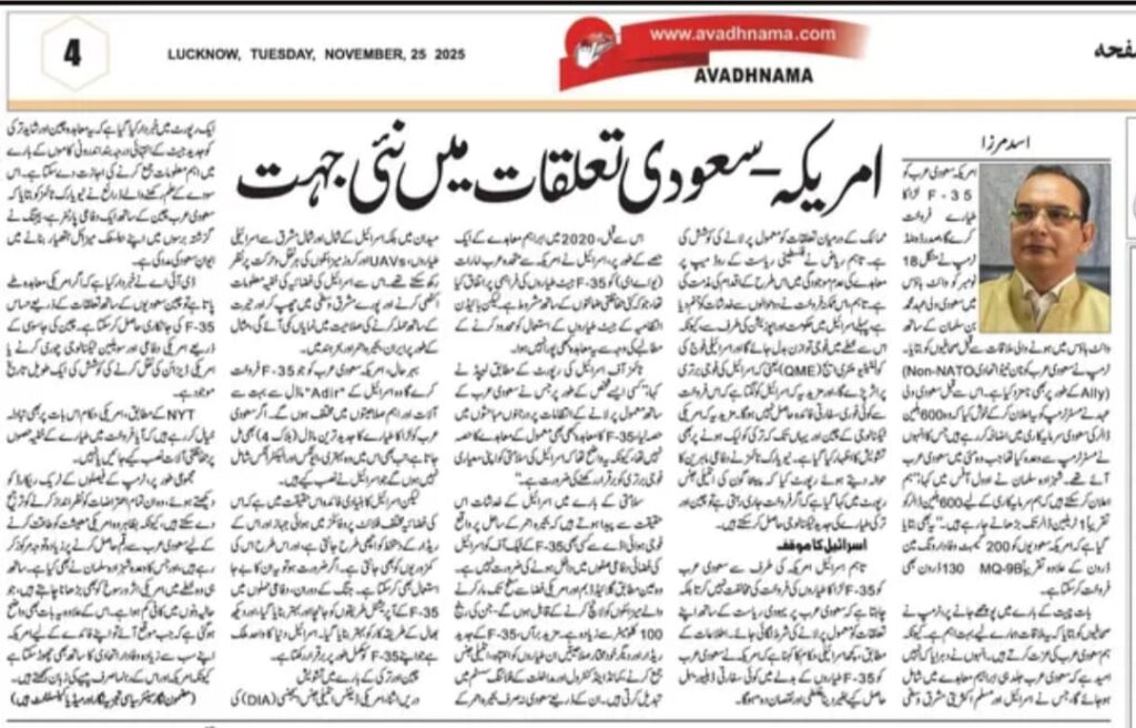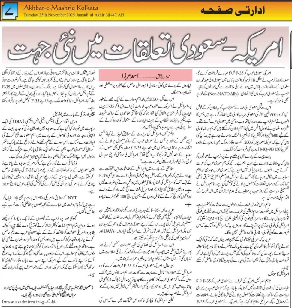 Categories December- 2025 Latest Articles in Urdu Amreeka- Saudi Taaluqat Mein Nayi Soorat Post author By am.media.nd@gmail.com Post date November 29, 2025 No Comments on Amreeka- Saudi Taaluqat Mein Nayi Soorat 3 total views, 3 views today ← Supreme Court Signalling Constitutional Rethink On Talaq Issue Has Wider Dimension → US Weighs Selling F-35 to Saudi Arabia Leave a Reply Cancel replyYour email address will not be published. Required fields are marked *Comment * Name * Email * Website Save my name, email, and website in this browser for the next time I comment.