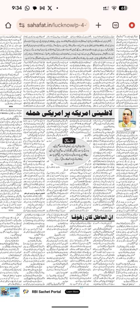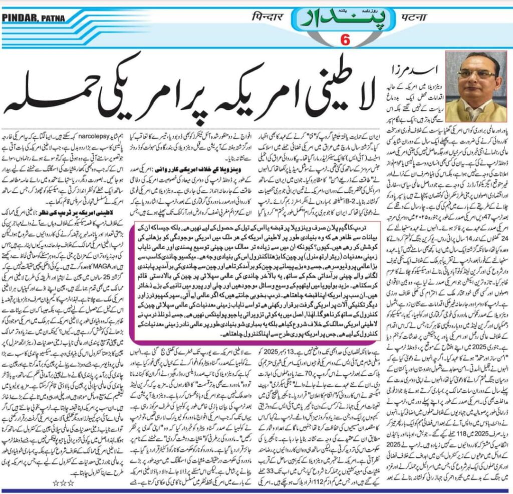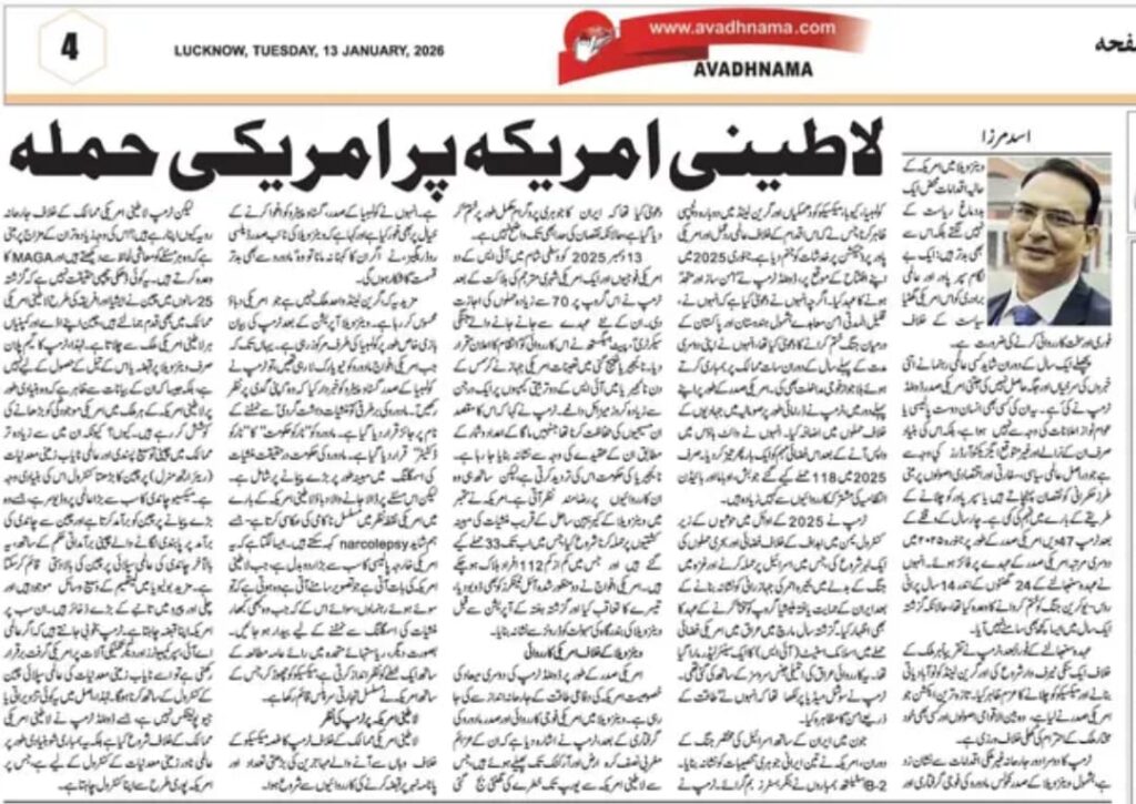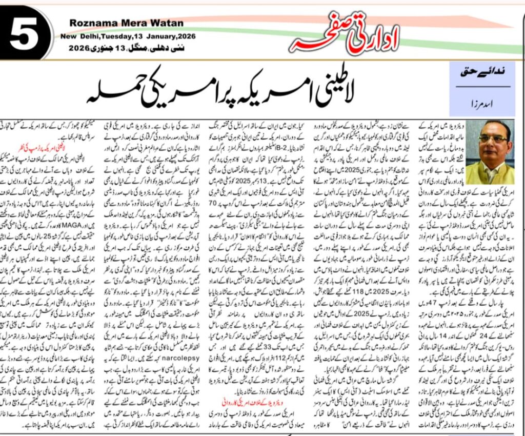 Categories January- 2026 Latest Articles in Urdu Latini Amerika par Ameriki Hamla Post author By am.media.nd@gmail.com Post date January 18, 2026 No Comments on Latini Amerika par Ameriki Hamla 6 total views, 2 views today ← Aalmi satah par adam-musawaat mein izafa. → American Onslaught on Latin America Leave a Reply Cancel replyYour email address will not be published. Required fields are marked *Comment * Name * Email * Website Save my name, email, and website in this browser for the next time I comment.